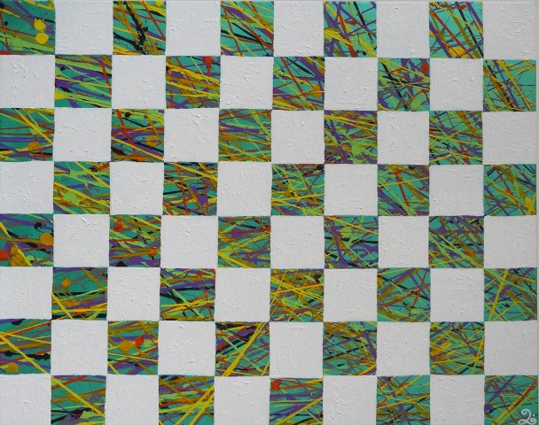 Face à ce miroir blanc, Lise laisse échapper son intérieur de façon plus ou moins consciente. « Quand je commence, ce n’est plus moi, je suis ailleurs » admet-elle dans un léger sourire teinté de gêne et d’excitation. Le résultat de ces divagations nocturnes se traduit en admirables compositions abstraites. Si elle diversifie les matériaux et les approches, sa technique de prédilection demeure celle du dripping. Popularisée par Jackson Pollock, cette façon de peindre par projection continue d’inspirer de nombreux plasticiens. Mais si les œuvres du fondateur de l’Action Painting révélaient une profonde noirceur, celles de mon interlocutrice s’avèrent de joyeuses créations aux tons vifs et dont l’harmonie finale laisse éclater un rayonnant équilibre.